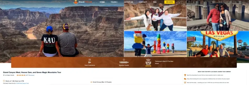 | MaxTour | Grand Canyon West, Hoover Dam, 7 Magic Mountains | Up to 14 | $179.99+ | Personalized service, expert guides, photo opportunities |