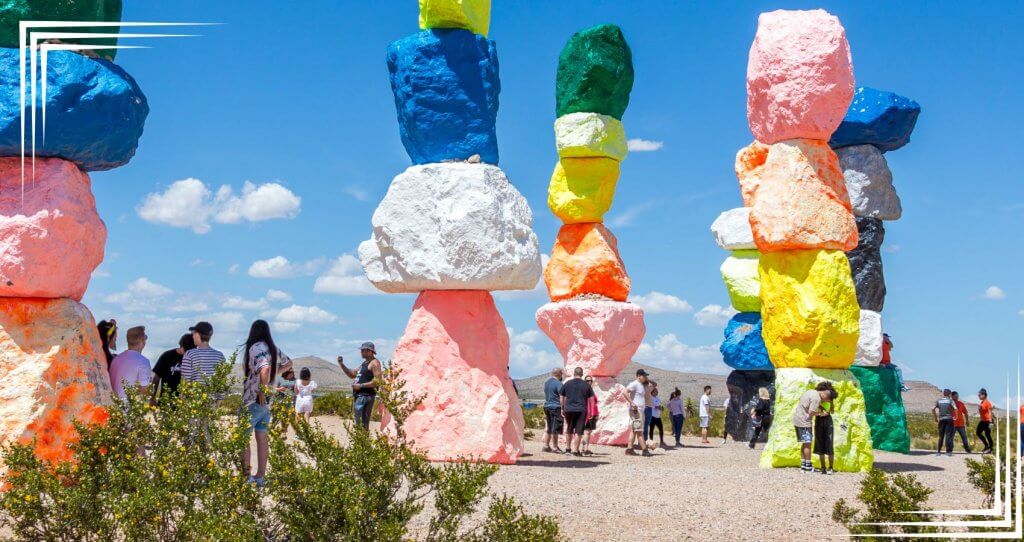 The installation stands over thirty feet tall and has become a surreal and photogenic destination since its unveiling in 2016. The meaning behind Seven Magic Mountains lies in its contrast between human creativity and the natural landscape, symbolizing the intersection of the artificial and the natural.