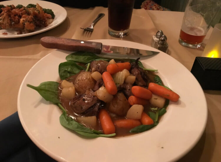 Las especialidades incluyen pechuga de pato a la parrilla y estofado bistro Guinness. Los precios de la cena se encuentran entre: los filetes cuestan a partir de 20 $ y las pastas 18 $.