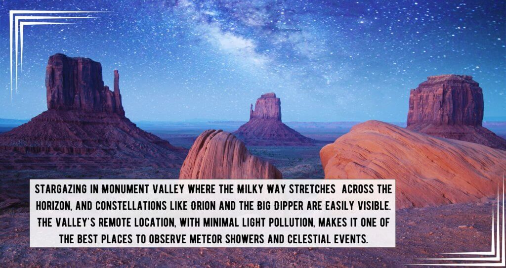 Monument Valley’s remote location, far from the light pollution of major cities, makes it an ideal spot for stargazing. On a clear night, the sky above the valley is a blanket of stars, with the Milky Way visible in all its glory.