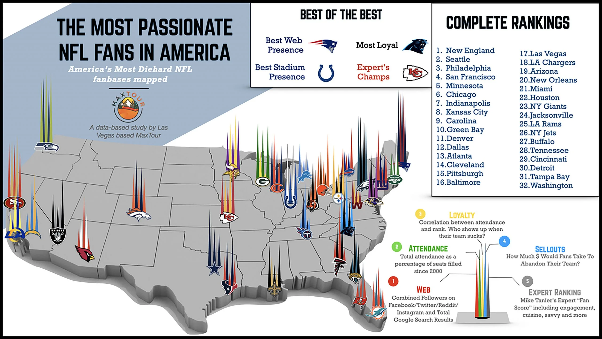 Expert Ranking: The Expert Ranking is based on the July 2019 article by Bleacher Report’s lead NFL writer, Mike Tanier. In it, Tanier develops a Fan Score based on the following categories (including decimals): Engagement (1-10), Cuisine (1-10), Savvy (1-10), and Internet Personality (-5 to +3). He then puts them together cumulatively to produce a “Fan Score”. Our adaptation is simple: Rank the NFL teams based on Tanier’s Fan Score. The higher the Fan Score the better your team’s ranking. Not exactly based on math, and therefore entirely subjective, but if it’s good enough for BR, it’s good enough for us. Source: https://bleacherreport.com/articles/2843690-mike-tanier-fixes-the-nfl-fanbase-rankings
