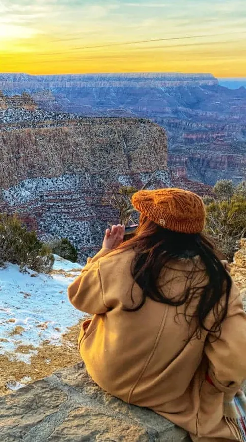 Woman in brown coat sits on cliff edge, gazing at Grand Canyon's vast beauty.
