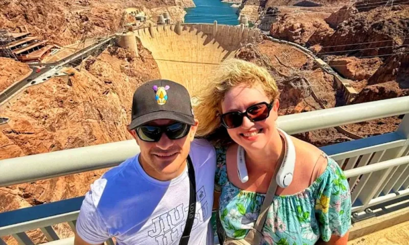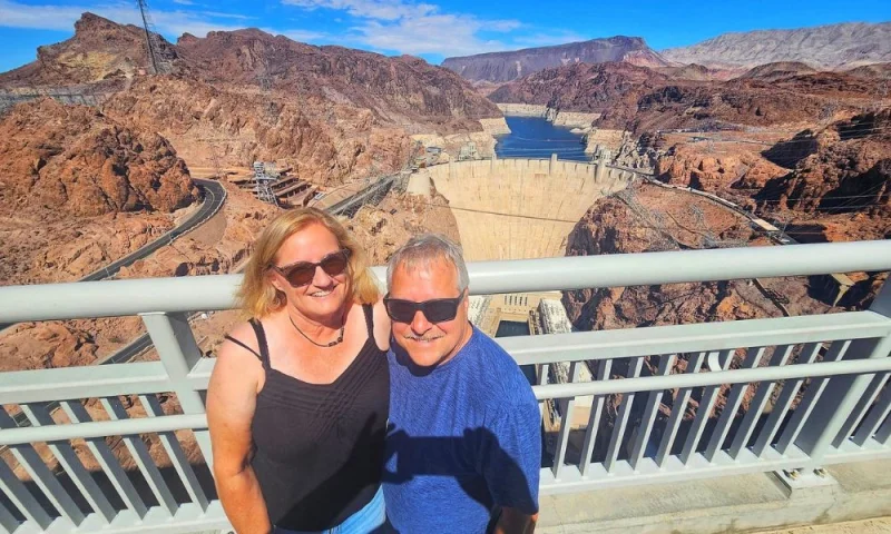 Tour guide walks with you across the top of the dam, pointing out the Art Deco sculptures, the bullet-riddled intake towers, and the spillways. You’ll stand with one foot in Nevada and one in Arizona!