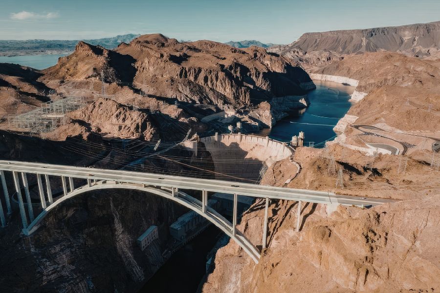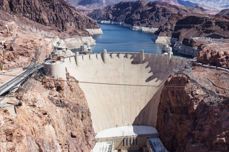 The Hoover Dam is designed to withstand enormous pressure from Lake Mead. It is a concrete arch-gravity dam, meaning its curved shape transfers water pressure into the canyon walls.