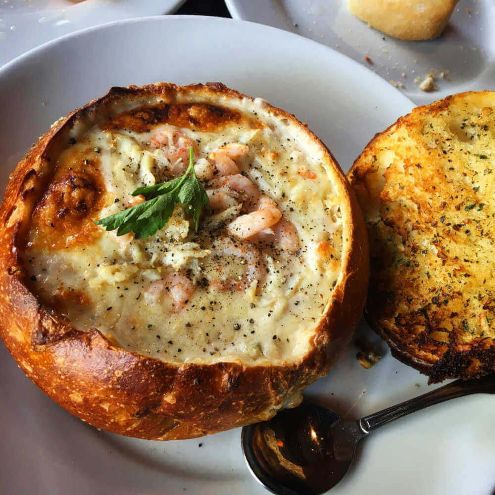 美國最著名的旅遊勝地之一便是坐落於舊金山的漁人碼頭。而去了漁人碼頭如果不品嚐一碗鮮香的蛤蜊濃湯,那麼您的旅途便不完整。盛在挖空的酸麵包碗中,蛤蜊濃湯可謂鹹香可口且光滑細膩。蛤蜊、土豆、奶油及蔬菜熬製的這款濃湯會讓您立刻為之俘獲芳心並且留住您的旅行記憶。而當您品嚐到湯的底部時,外脆里嫩的酸麵包充分浸蘸了蛤蜊湯,您會發現原來“碗”也是一道美味。