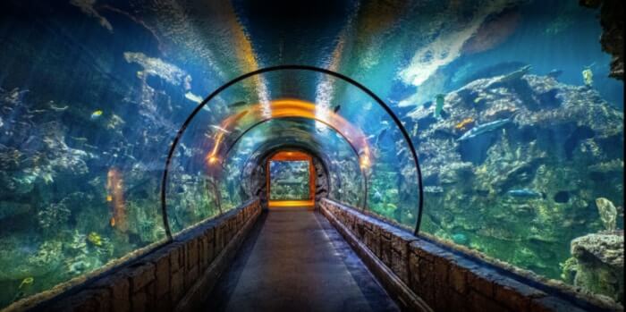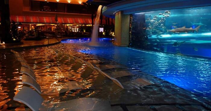 在拉斯維加斯市中心的Slotzilla索道旁邊,你會看到水族箱泳池。這是弗里蒙特街目前最好的游泳池,很適合全家玩樂。游泳池周圍是一個75萬升以上的鯊魚缸。還有一個水滑道可以帶你穿過鯊魚缸!